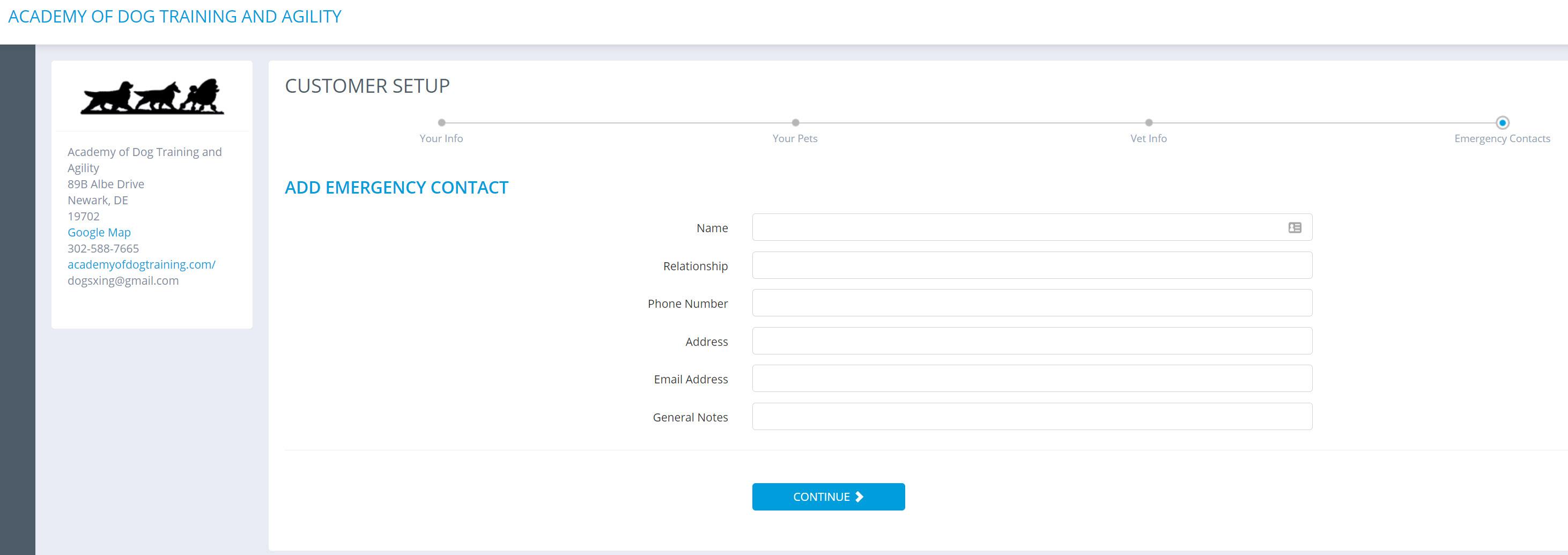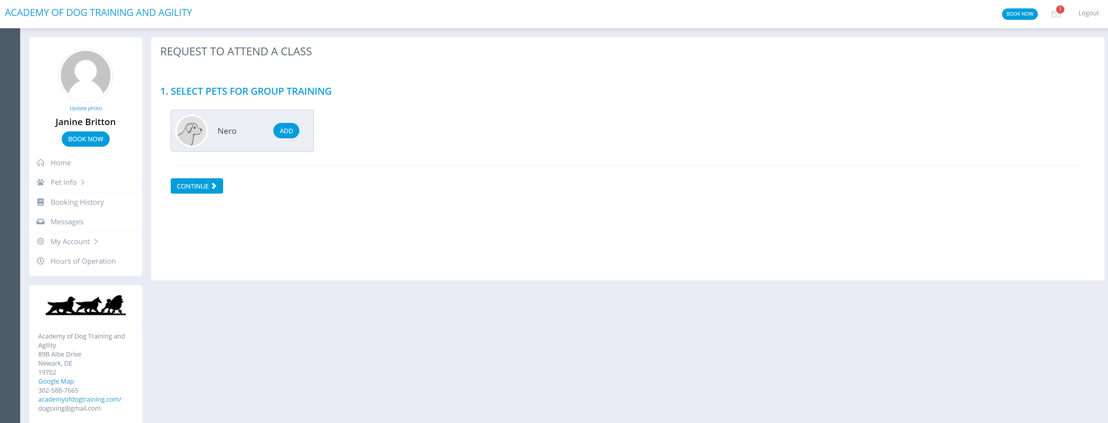 Select which pet will be attending the class by clicking the ADD button next to the desired pet, then click CONTINUE. This next page wil appear: